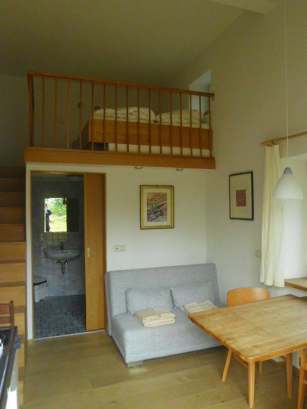 Apartment I. Dieses helle Apartment im Erdgeschoss verfügt über eine Terrasse, eine komplett ausgestattete Küchenzeile und ein eigenes Bad. Darüber hinaus erwarten Sie kostenloses WLAN, Eichenböden und ein eigener Eingang. Um die ruhige Atmosphäre dieses Apartments nicht zu stören, sind kein TV und keine HiFi-Anlage vorhanden. Das Bett befindet sich auf einem Schlafboden, der über eine Treppe erreichbar ist. ;