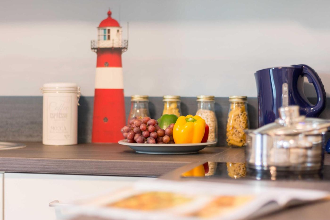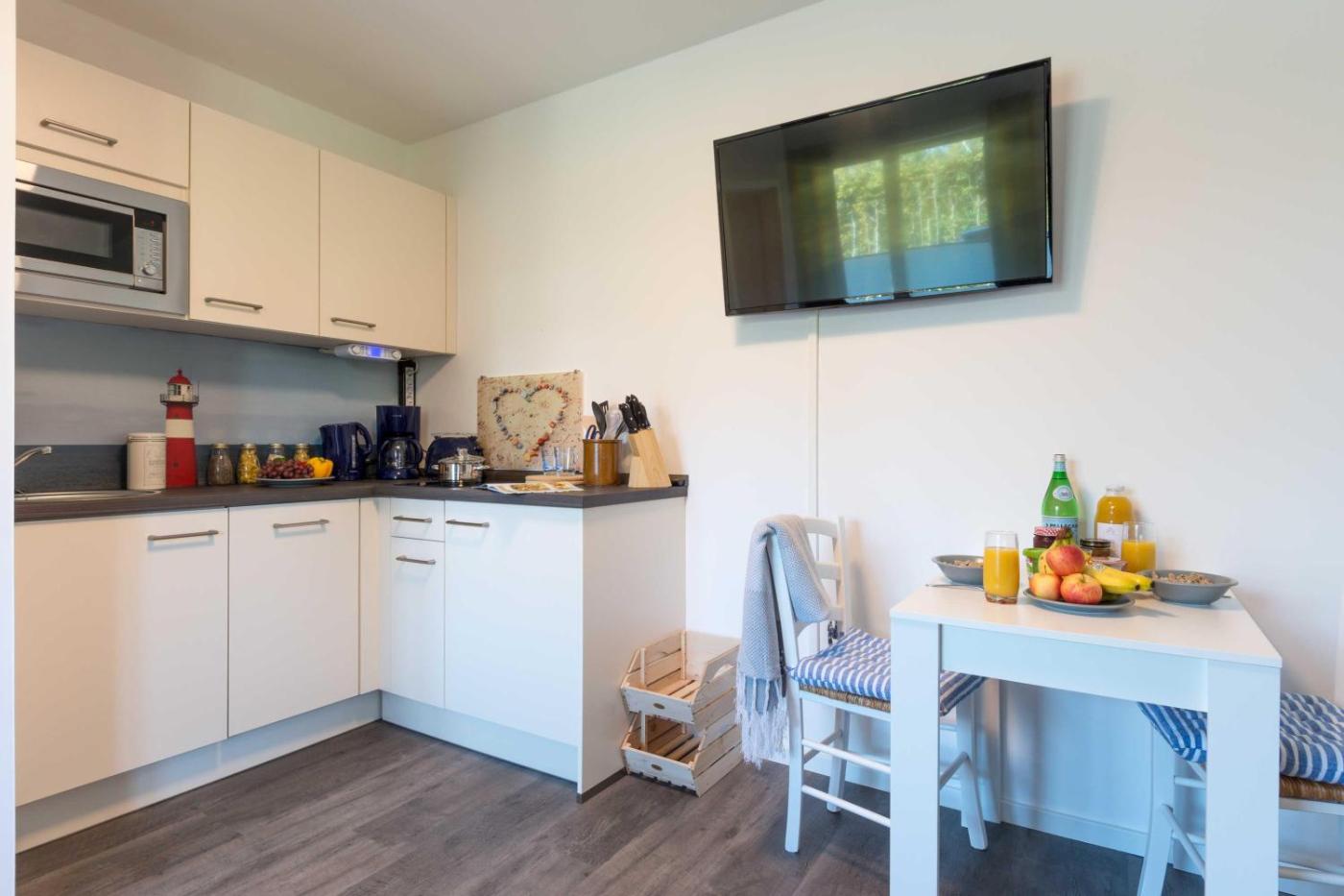 Diese Ferienwohnung ist ausgestattet mit einem Kabel TV und einem Wohnzimmer. Die Küche ist eingerichtet mit einem Kühlschrank und einem Geschirrspüler, einer Mikrowelle sowie einer Kaffeemaschine und einem Wasserkocher.