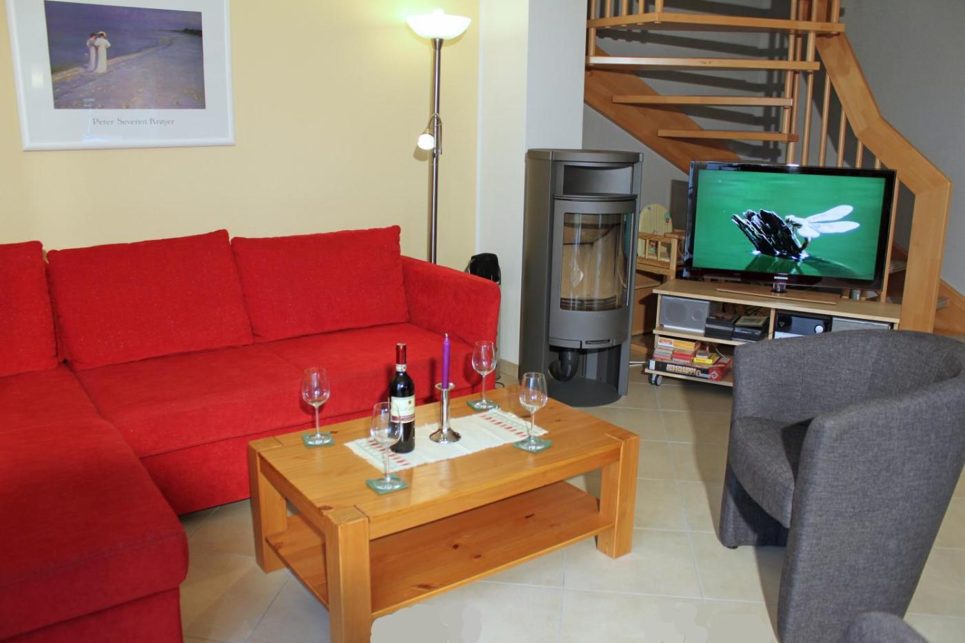 Haus mit 3 Schlafzimmern. This holiday home offers a fireplace. This holiday home comprises 1 living room, 3 separate bedrooms and 2 bathrooms with a bath and a shower. Meals can be prepared in the kitchen, which comes with a stovetop, a dishwasher, kitchenware and an oven. Featuring a terrace with garden views, this holiday home also provides a washing machine and a flat-screen TV. The unit offers 5 beds.