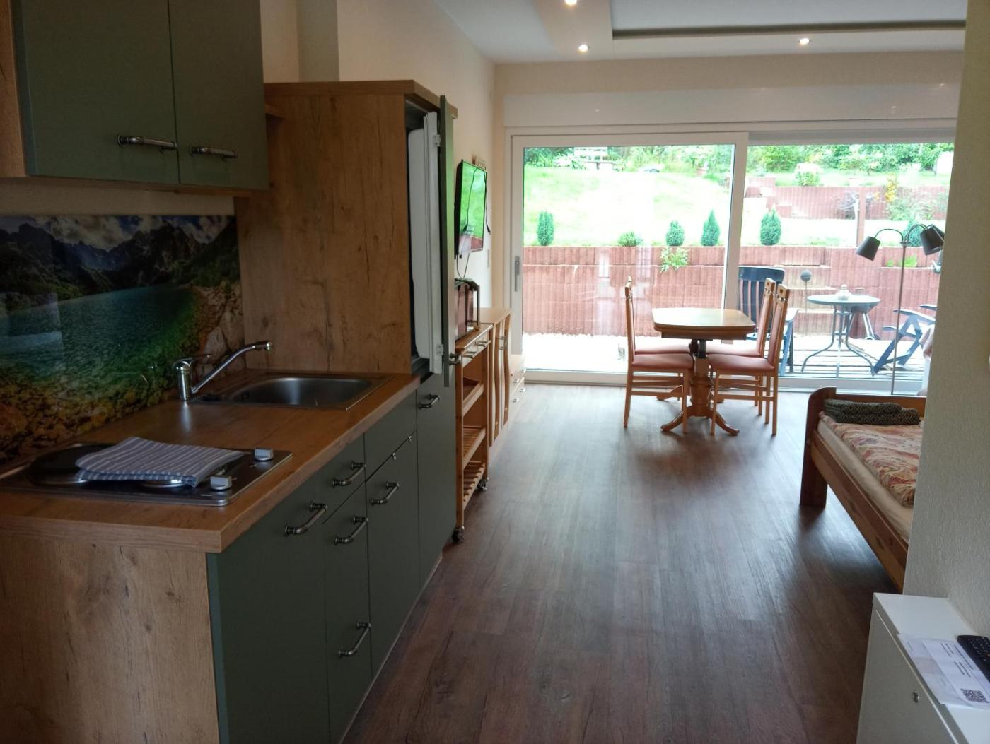 Apartment mit Gartenblick. This spacious apartment consists of 1 living room, 1 separate bedroom and 1 bathroom with a walk-in shower and a bath. The well-fitted kitchenette features a stovetop, a refrigerator, a dishwasher and kitchenware. Featuring a terrace with garden views, this apartment also provides a washing machine and a flat-screen TV with satellite channels. The unit offers 7 beds. ;