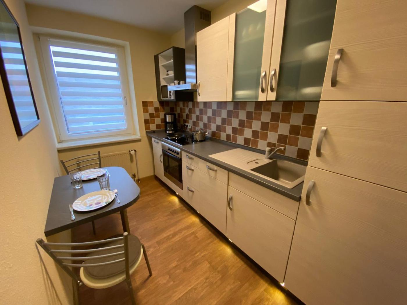 Apartment mit 1 Schlafzimmer. This apartment consists of 1 living room, 1 separate bedroom and 1 bathroom with a bath and a shower. Guests can make meals in the kitchen that is equipped with a stovetop, a refrigerator, a dishwasher and kitchenware. The apartment provides a washing machine, soundproof walls, a tea and coffee maker, a flat-screen TV with satellite channels, as well as garden views. The unit offers 2 beds.