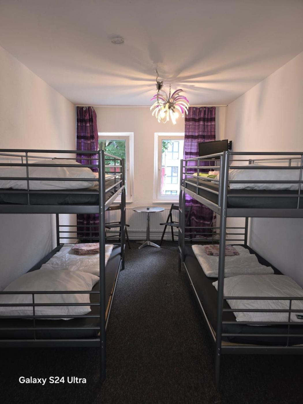 Vierbettzimmer mit Gemeinschaftsbad. Mit Etagenbetten sowie Gemeinschaftsbad und -WCs auf dem Flur. ;