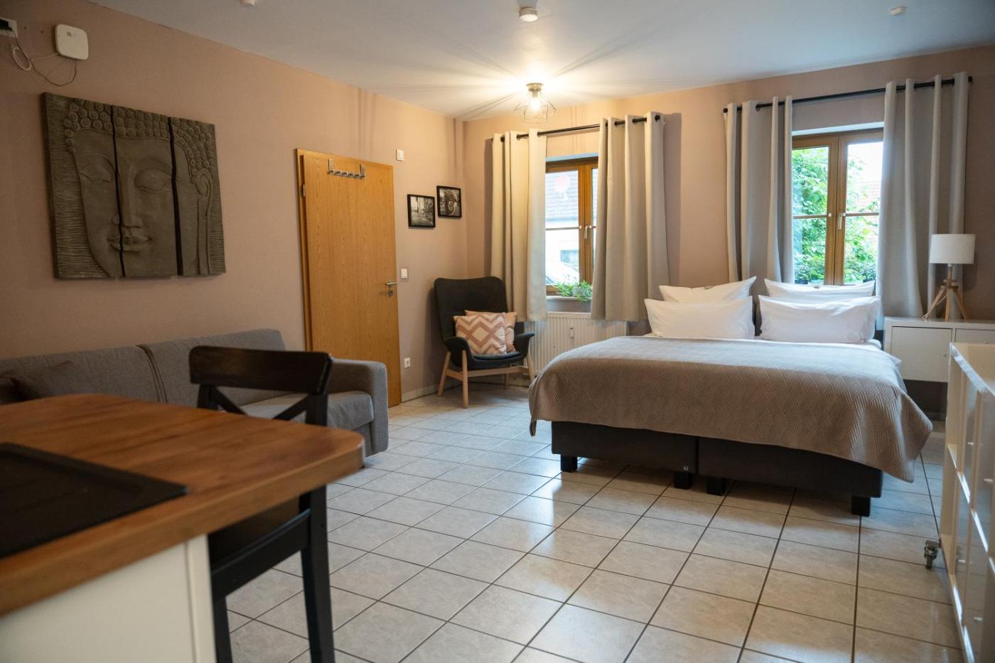 Apartment mit 2 Schlafzimmern (FEWO 5). Diese luxuriöse Ferienwohnung verfügt über einen Whirlpool, eine Hydromassage-Wanne und eine Sauna. Diese geräumige Ferienwohnung mit eigenem Eingang umfasst 1 Wohnzimmer, 2 separate Schlafzimmer sowie 1 Bad mit einer ebenerdigen Dusche. Die voll ausgestattete Küche umfasst ein Kochfeld, einen Kühlschrank, eine Spülmaschine und Küchenutensilien. Ein Grill ist an der Ferienwohnung ebenfalls vorhanden. Zu den weiteren Vorzügen der Ferienwohnung zählen eine Waschmaschine, schallisolierte Wände sowie Tee- und Kaffeezubehör. Ein Flachbild-TV mit Streaming-Diensten sorgt zudem für Unterhaltung. Freuen Sie sich auch auf Gartenblick in der Unterkunft. Die Wohneinheit ist mit 3 Betten ausgestattet. ;