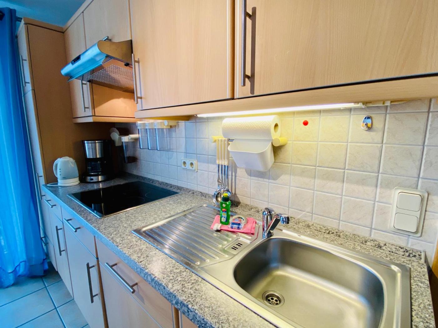 Diese Ferienwohnung besteht aus 1 Schlafzimmer, einem Wohnzimmer, einer voll ausgestatteten Küchenzeile mit einem Kühlschrank und einer Kaffeemaschine sowie 1 Badezimmer mit einer Dusche und einem Haartrockner. In dieser Ferienwohnung werden Handtücher und Bettwäsche angeboten.