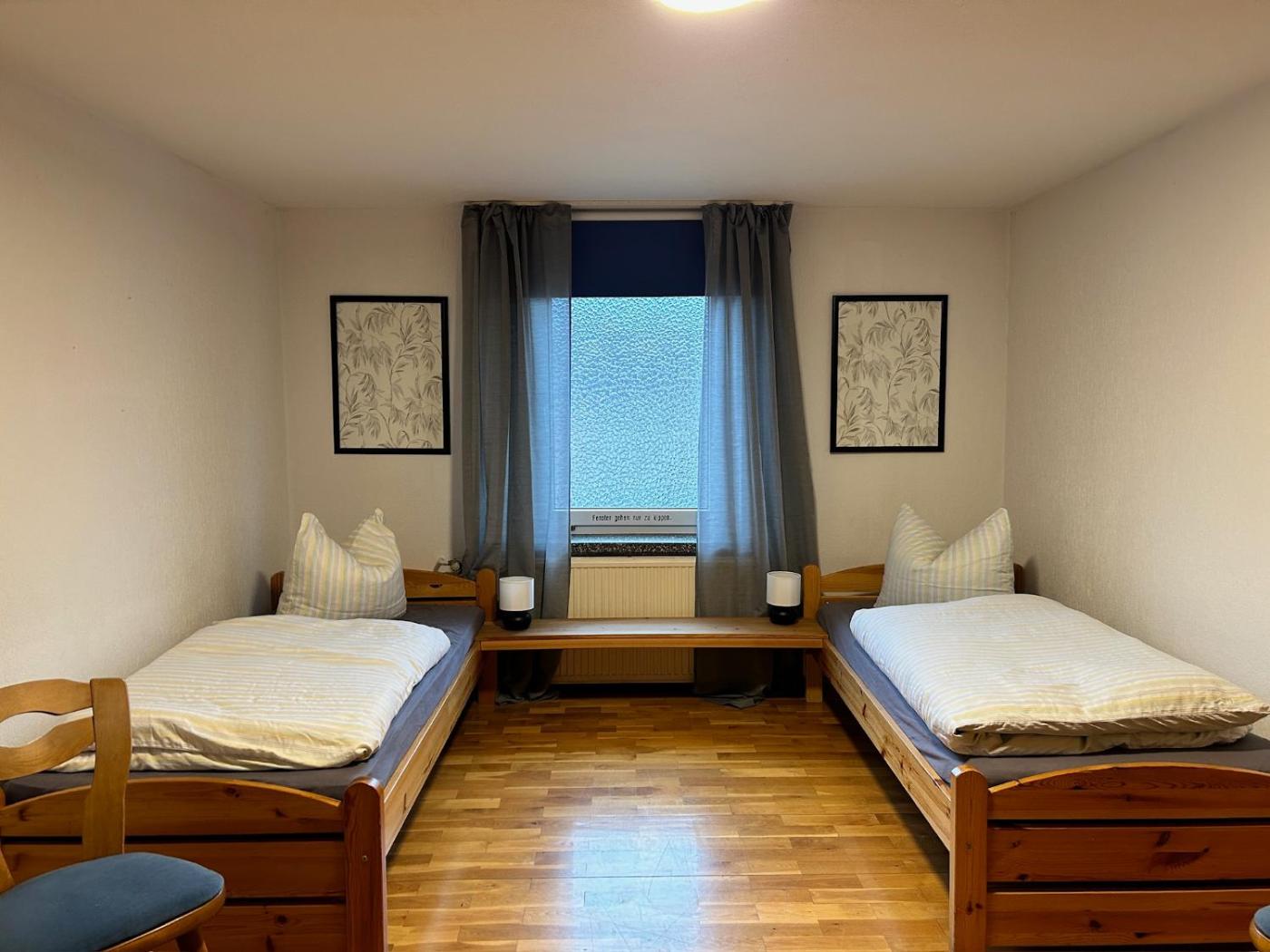Standard Zweibettzimmer mit Gemeinschaftsbad. The twin room features a shared bathroom fitted with a shower and a hairdryer. The twin room has parquet floors, a seating area with a flat-screen TV with streaming services, a dining area, a wardrobe, as well as heating. The unit has 2 beds.