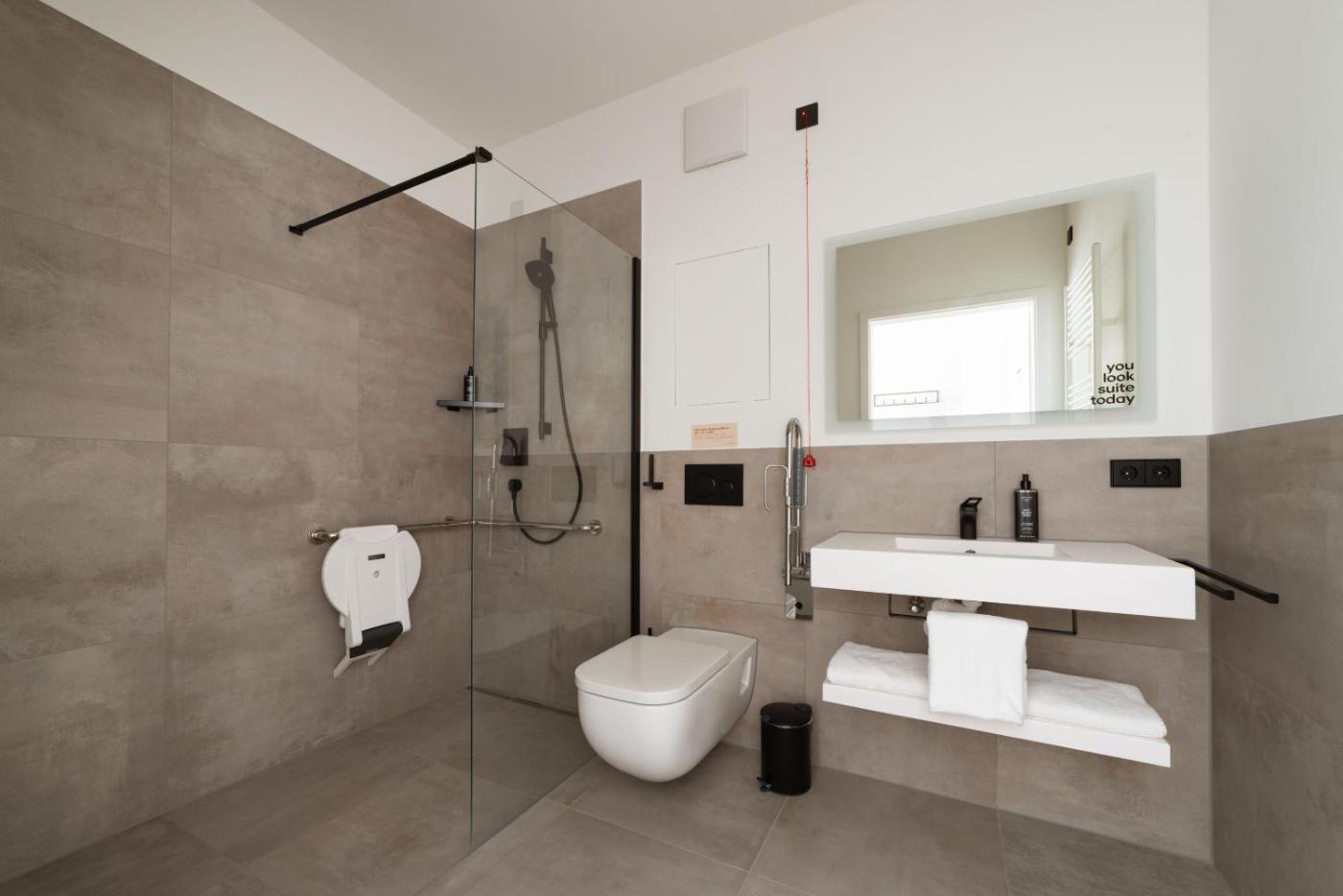 Suite (barrierefrei). In der Suite finden Sie 1 Schlafzimmer sowie 1 Bad mit einer ebenerdigen Dusche und kostenlosen Pflegeprodukten vor. Mahlzeiten können Sie sich in der Küche zubereiten, die über ein Kochfeld, einen Kühlschrank, Küchenutensilien und einen Toaster verfügt. Die beheizbare Suite bietet zudem eine Kaffeemaschine, einen Essbereich, einen Kleiderschrank und einen Flachbild-TV. Die Wohneinheit ist mit 1 Bett ausgestattet. ;