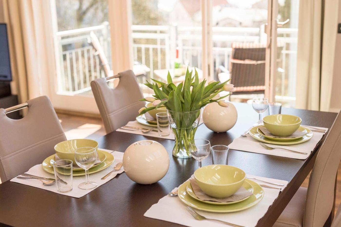 Deluxe Apartment mit 3 Schlafzimmern - Bernstein. Dieses Apartment auf der obersten Etage, das Apartment 7 (Bernstein), verfügt über ein Wohnzimmer, eine Einbauküche, 2 Schlafzimmer, ein Bad, einen Abstellraum und 2 Balkone mit Blick auf die Ostsee. Freuen Sie sich auch auf eine Fußbodenheizung und kostenfreies WLAN. ;