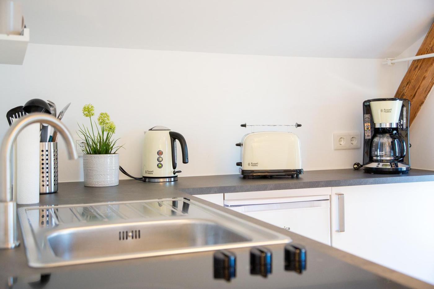Die Küche ist ausgestattet mit einem Kühlschrank und einem Geschirrspüler, einem Ofen sowie einer Kaffeemaschine und einem Wasserkocher.