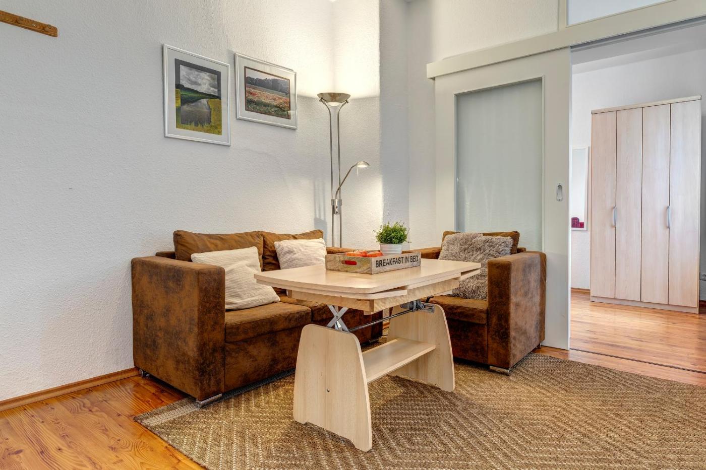 Apartment mit 1 Schlafzimmer. This apartment includes 1 living room, 1 separate bedroom and 1 bathroom with a shower and a hairdryer. The well-equipped kitchen has a refrigerator, kitchenware, a toaster and an electric kettle. This apartment features a wardrobe, heating and a TV. The unit has 2 beds.